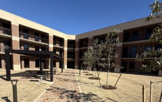 Each dorm room is accessed from an exposed exterior balcony.